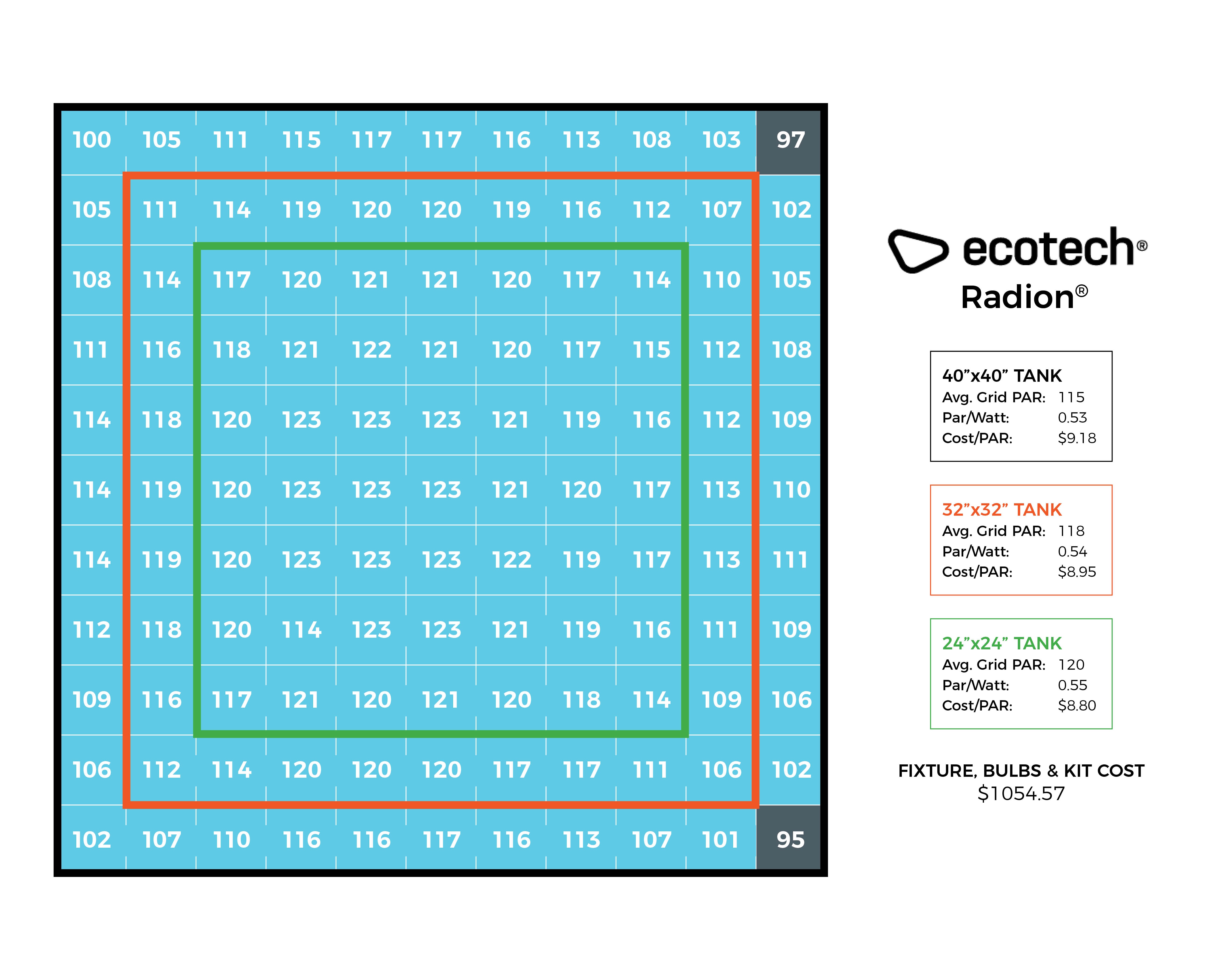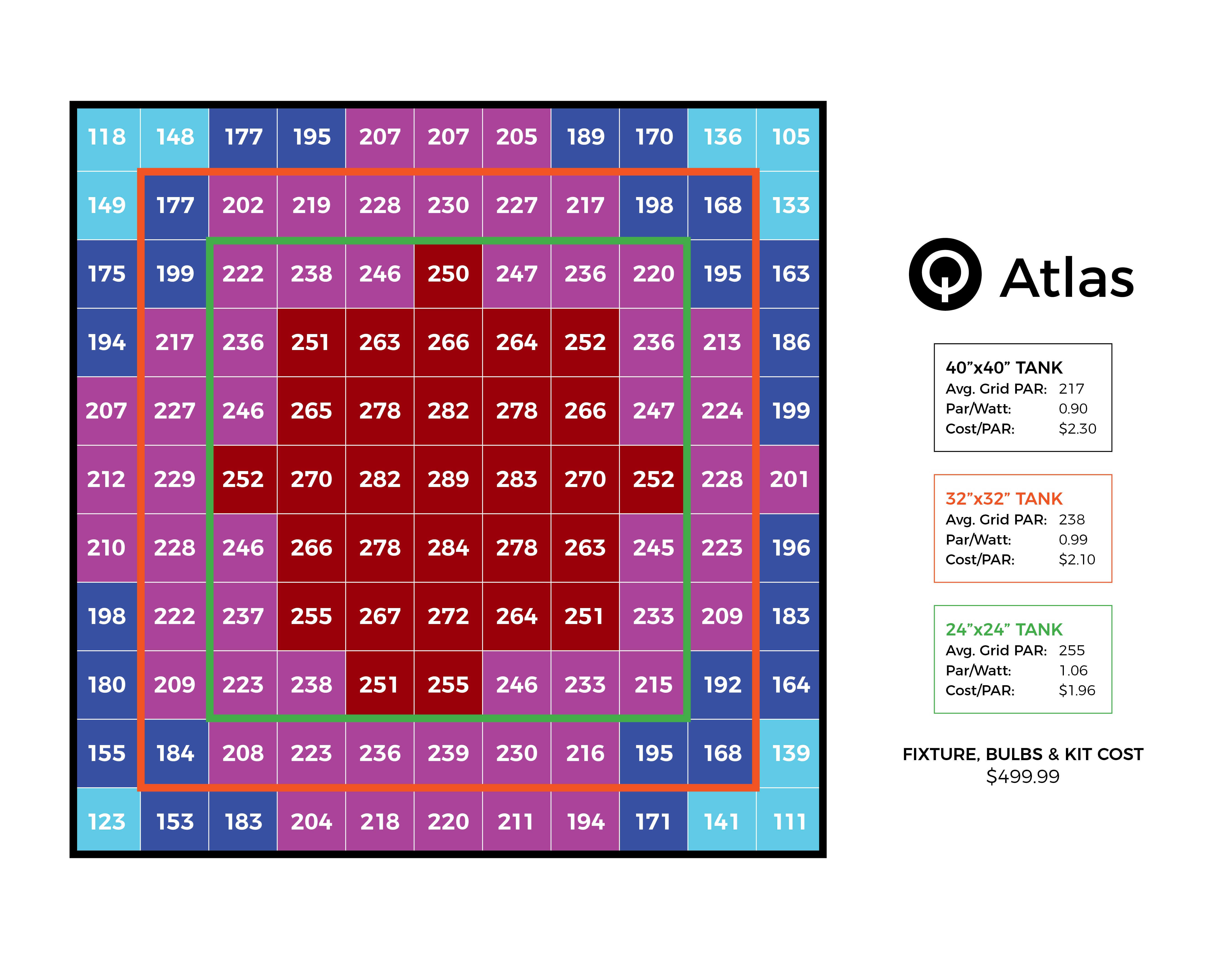 We take our research and testing very seriously at Quanta. Below is the data from our dry PAR testing for the Atlas and its main competitor on the market. The data shows that it is the clear leader in efficiency, cost effectiveness, and the amount and large spread of light provided.