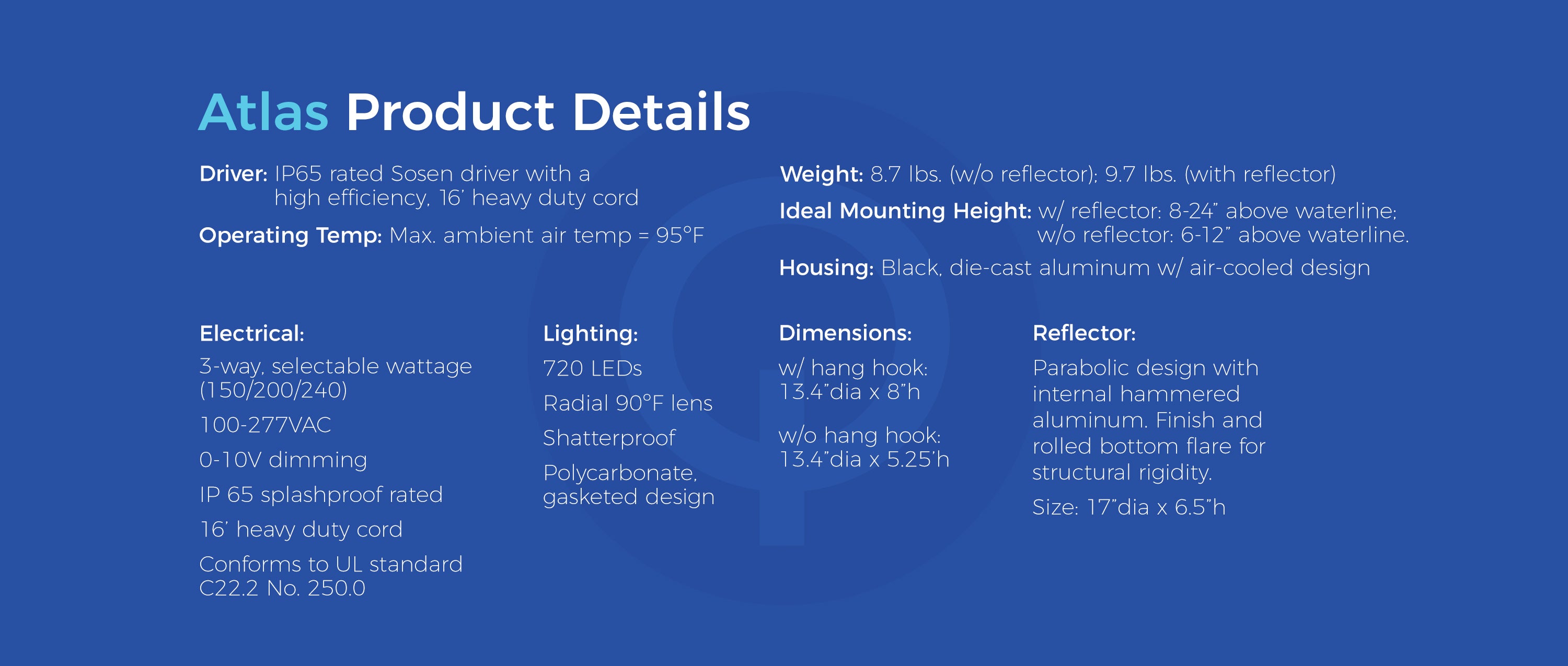 Designed with a fan-less heat sink, waterproof electronics, and gasketed primary lens, the Atlas can be cleaned with a cloth and water in less than 5 minutes